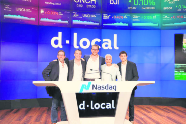 Representantes de d-local Sergio Fogel, Andrés Bzurovski, Sebastián Kanovich, Eduardo Azar y Jacobo Singer, en la bolsa de Nueva York...