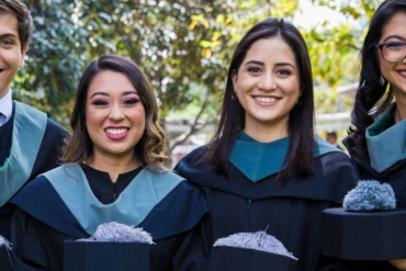 InnovaciónDescripción de la foto para personas con discapacidad visual: Cuatro jóvenes sonrientes usando toga y sosteniendo sus birretes en las...