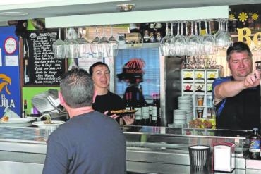 Remi Galiano y Miguel Merino, detrás de la barra del bar La Bota, atienden a un cliente, este lunes. /...