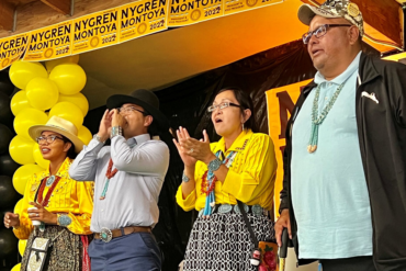 Navajo Nation President-elect Buu Nygren celebrates his victory by shouting to his supporters on election night. Joining him, from left...